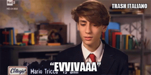 A young man from Il Collegio enthusiastically exclaims 'Evviva!' with hands raised.