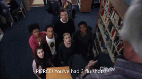 Pierce Hawthorne from Community declares himself a living god after getting multiple flu shots for the daycare center.