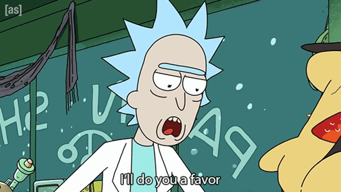 Rick from Rick and Morty, in his signature lab coat, points his finger and says 'I'll do you a favor'.