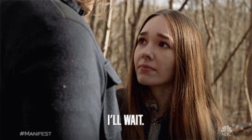 Angelina Meyer, played by Holly Taylor, patiently tells a man, 'I'll Wait,' in a forest setting.