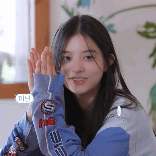 Illit's Minju claps adorably, wearing a stylish blue jacket with an 'S' logo.