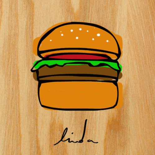 A vibrant illustration of a hamburger, featuring a sesame seed bun, lettuce, and a patty, with 'Linda' handwritten below.