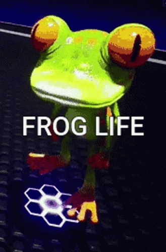 Animated Illuvium frog wearing pixelated Thug Life glasses, standing on a glowing platform with 'FROG LIFE' text.