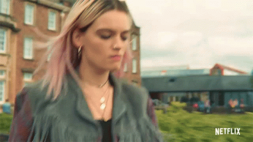 Maeve Wiley (Emma Mackey) from Sex Education walks with a determined expression on campus.