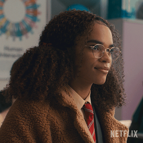 Elle Argent, played by Yasmin Finney, smiles and says 'I'm fine' while wearing glasses and a brown coat.