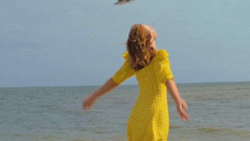 Suzanna Son in a yellow dress, arms outstretched by the ocean, embodying freedom.