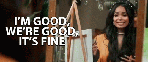 Elah Hale, an artist, expresses 'I'm Good, We're Good, It's Fine' while holding a paintbrush by an easel.