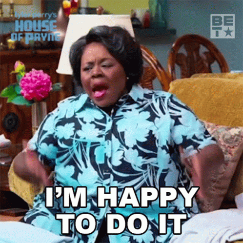 Ella Payne, portrayed by Cassi Davis, enthusiastically states 'I'm Happy To Do It' on Tyler Perry's House of Payne.