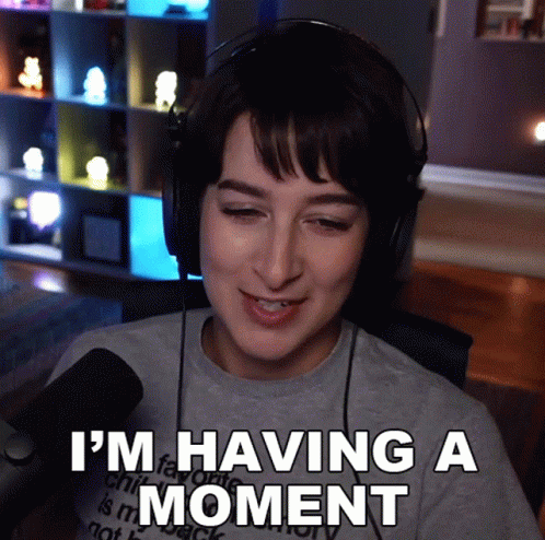 Feralwife, wearing headphones, expresses 'I'm having a moment' with a smile and a slight head tilt.
