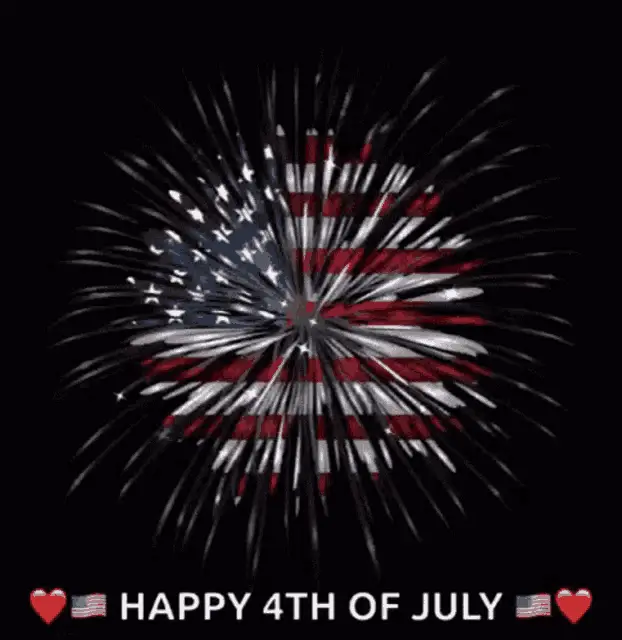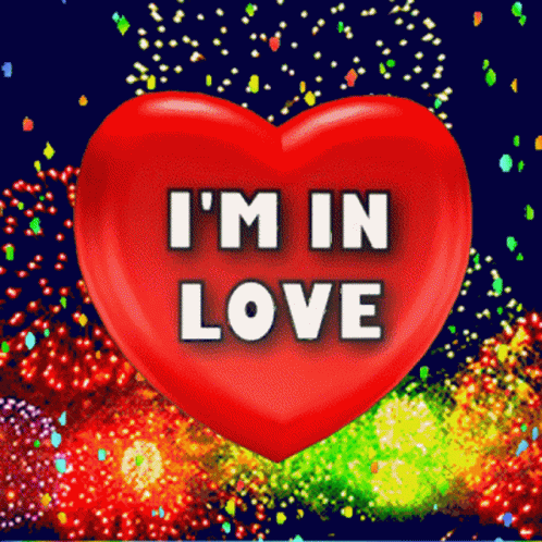 A vibrant red heart displaying 'I'M IN LOVE' against a backdrop of colorful, sparkling fireworks.