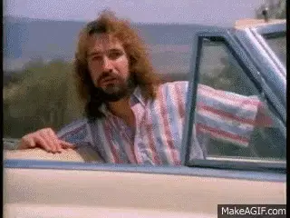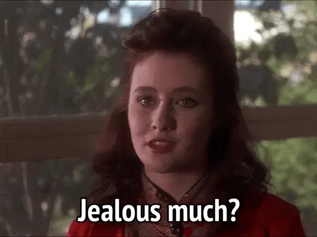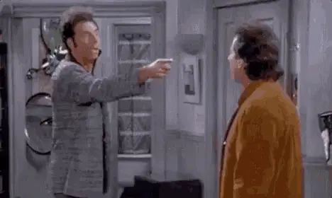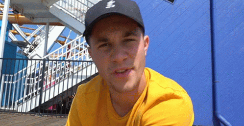 A man in a yellow shirt and black hat expresses jealousy while standing in front of a roller coaster at an amusement park.