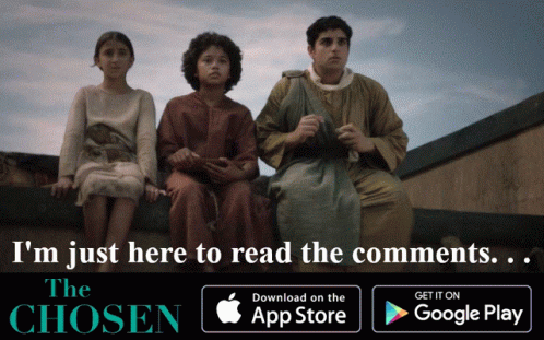 Matthew, Abigail, and Joshua from The Chosen sit on a rooftop, with Matthew eating grapes, as text encourages reading comments and downloading the app.