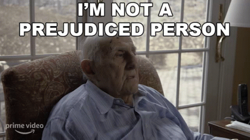 Gabriel Golam sits in a chair with the text 'I'm Not A Prejudiced Person' displayed, from Prime Video.