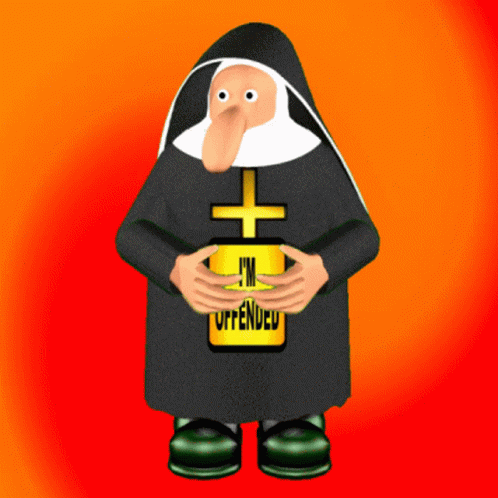 Animated nun holds up a sign that reads 'I'M OFFENDED'.