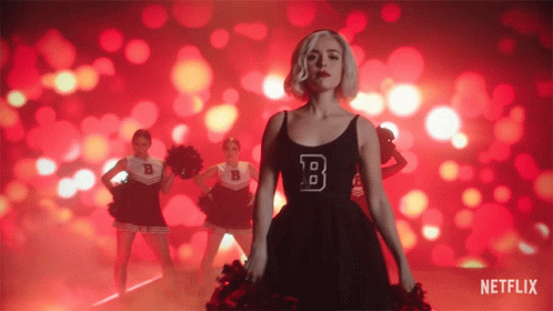 Kiernan Shipka as Sabrina Spellman in a cheerleader outfit, dancing with a 'B' on her top.