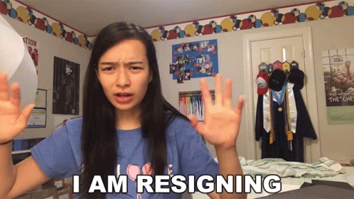 A girl in a blue shirt dramatically declares 'I am resigning' with her hands raised in a bedroom.