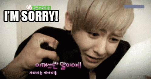 K-pop idol Nichkhun looks distressed with sweatdrop emojis, saying 'I'M SORRY!' in a meme-like clip.