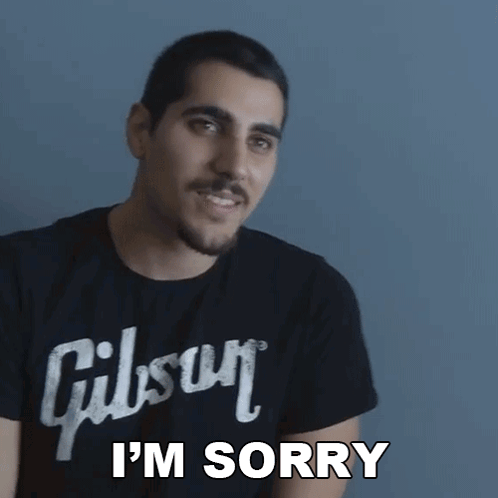 Rudy Ayoub, wearing a black Gibson t-shirt, expresses his apology with 'I'm Sorry'.