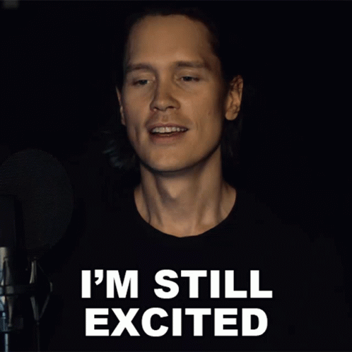 Pellek passionately sings into a microphone with the phrase 'I'M STILL EXCITED' displayed behind him.