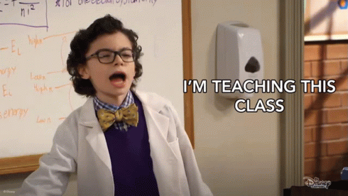Matteo Silva, in a lab coat and bow tie, confidently declares 'I'm Teaching This Class' in a classroom.