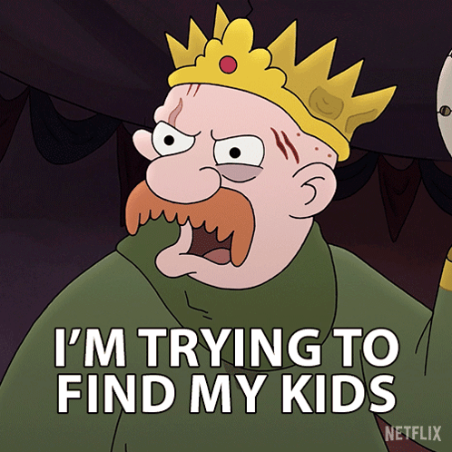 King Zøg from Disenchantment dramatically declares, 'I'M TRYING TO FIND MY KIDS,' with a shift from anger to sadness.