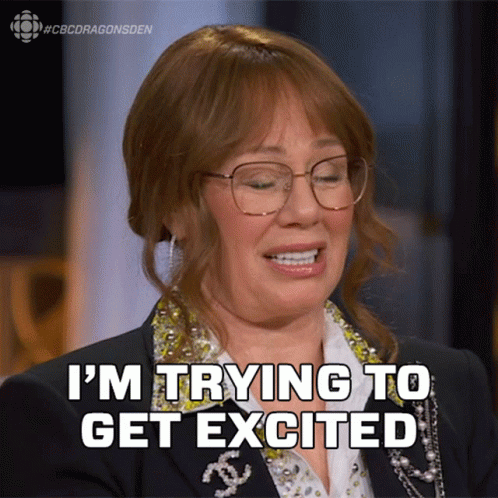 Arlene Dickinson from CBC Dragons' Den says, 'I'm trying to get excited about it,' with a thoughtful expression.