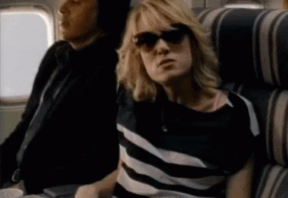 Kristin Wiig, wearing sunglasses and a striped shirt, points directly at the viewer from an airplane seat.