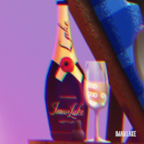 Animated Black couple relaxing on a beach under an umbrella with Iman Lake champagne, featuring 'Neptune'.