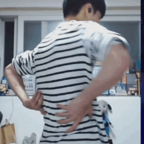 Imfact Jeup reacts to back pain, stretching his lower back in a striped shirt.