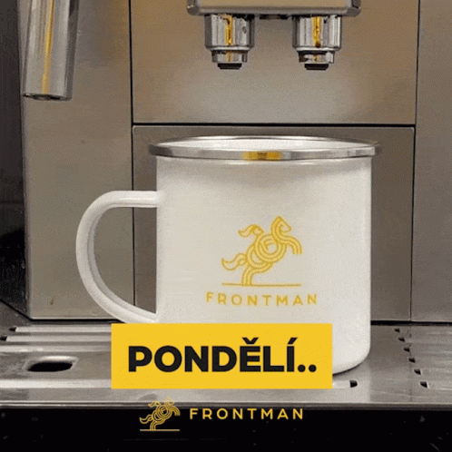 A white mug with the Frontman logo is filled with freshly brewed coffee from an espresso machine, marking the start of Monday.