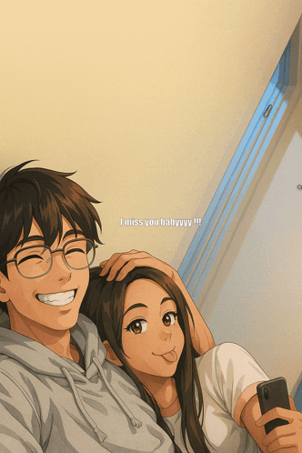 An adorable anime couple with the message 'i miss you babyyyy !!!', depicting a long-distance relationship.