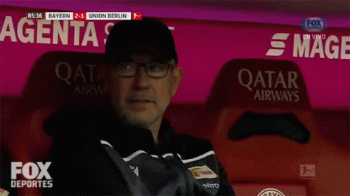 Urs Fischer, coach of FC Union Berlin, looks around impatiently and upset during a football match against FC Bayern.