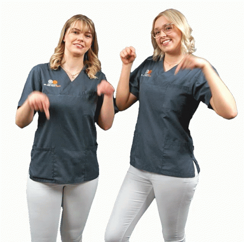 Two women from Implantatzentrumherne Herne smiling and pointing down, representing Dr. Stefan Helka's dental practice.