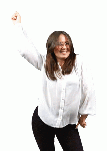 A happy woman with glasses and a white shirt dances energetically at Implantatzentrumherne in Herne.