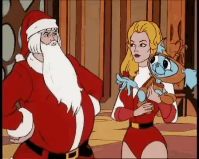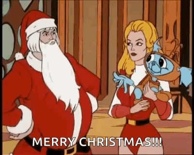 He-Man dressed as Santa and She-Ra with a creature wish a Merry Christmas.