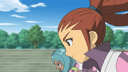 a girl with red hair and a ponytail is standing on a set of stairs with trees in the background