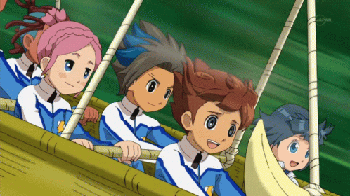 Characters from Inazuma Eleven Go Galaxy, including Sorano Aoi and Matatagi Hayato, enjoy a fast ride in a hot air balloon.