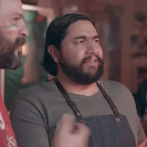 Daniel García, a bearded man in an apron, displays an uncomfortable and awkward expression, looking sideways.