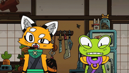 Akai, the fox, and Flink, the frog, look confused and awkward in a scene from Ninjin Para Todas Partes.