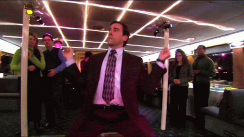 Michael Scott, played by Steve Carell, performs an energetic and crazy dance on a boat party, entertaining onlookers.