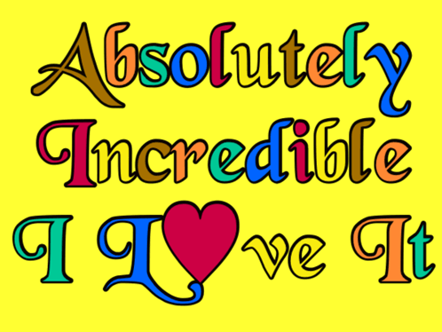 Animated text on a yellow background displays 'Absolutely Incredible I Love It' with changing letter colors.