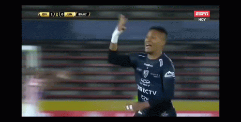 A soccer player from Independiente Del Valle (IDV) celebrates a goal, wearing a jersey with DIRECTV sponsor.