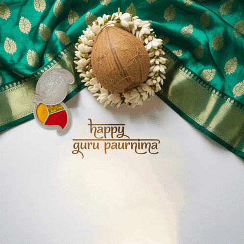 Celebrate Guru Purnima with traditional Indian offerings, including a coconut, jasmine garland, and sweets.