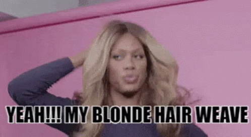 A woman proudly shows off her blonde hair weave, exclaiming 'Yeah! My blonde hair weave!'
