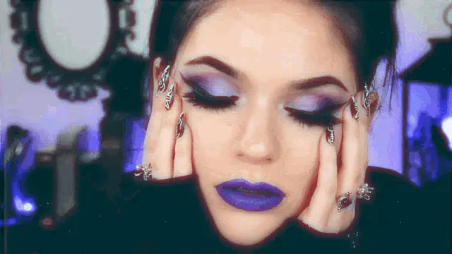 Woman showcasing an Indiquehair Hairlove ombre ponytail hairstyle with vibrant blue hair and matching makeup.