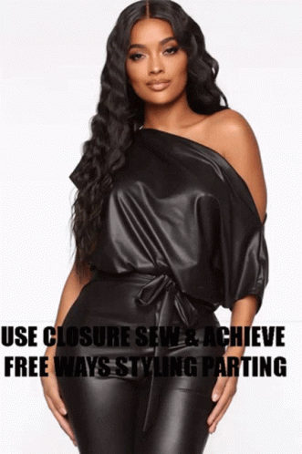 A woman showcases long, wavy hair and a black off-shoulder top, demonstrating free ways styling parting with closure sew.