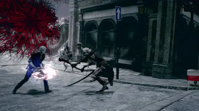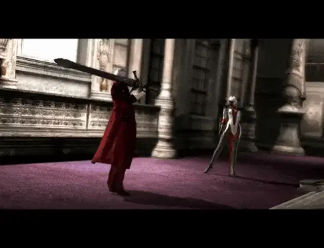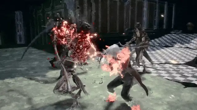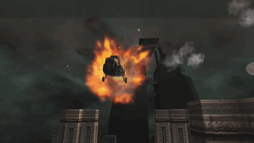 Intense boss fight against the Infested Chopper in Devil May Cry 2, featuring explosions and aerial combat.
