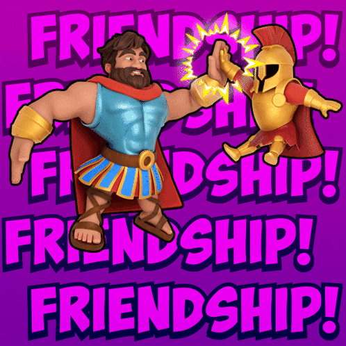 Hercules and Spartan from Infinigods Kingofdestiny share a high five, surrounded by the word "FRIENDSHIP!".
