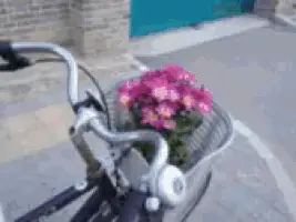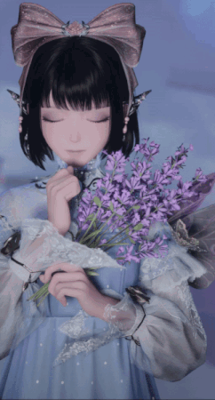 Infinity Nikki, with fairy ears and a pink bow, gently holds a lavender bouquet in her blue dress.