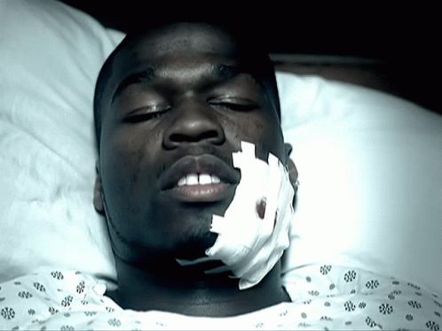 50 Cent (Curtis James Jackson Iii) lies injured in a hospital bed with a bandage on his face, recovering.